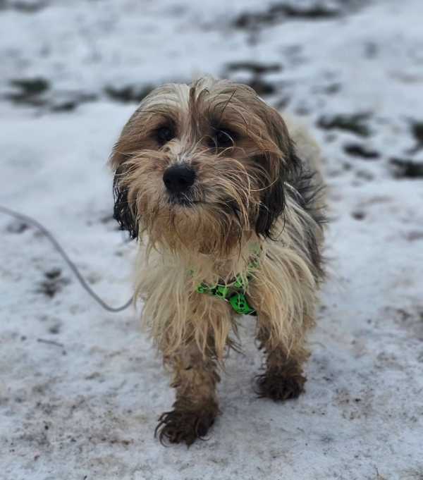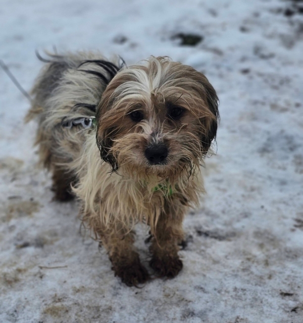 Der kleine Rüde hat einen großen Teil seines Lebens mit anderen Hunden auf einem verwahrlosten Grundstück verbracht.