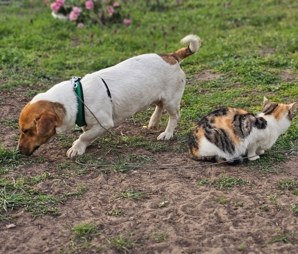 Katzen, die Erfahrung mit quirligen Hunden haben, sind für ihn auch kein Problem.
