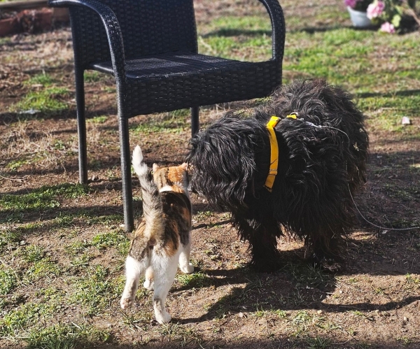 Mit seinen Artgenossen und den Samtpfoten kommt er zurecht, wenn er Platz, also eine ruhige Ecke, hat.