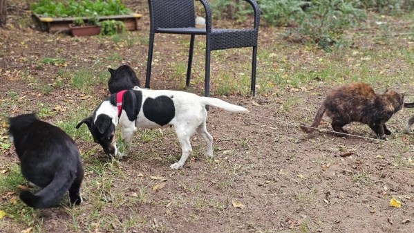 Mit den Hunden hat sie sich arrangiert, mit Katzen ist sie umgänglich und bedrängt sie nicht.