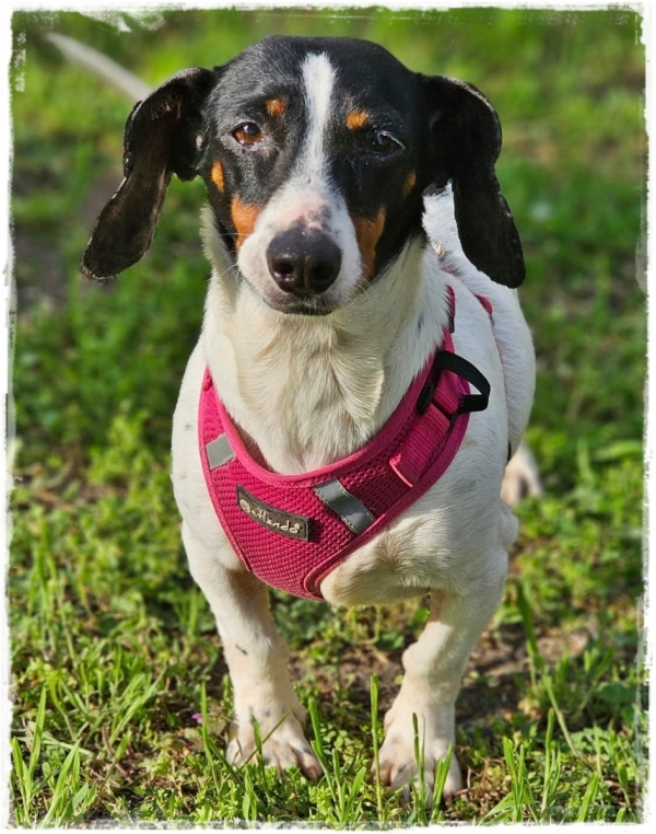 Marti, Hündin, Jack Russell-Dackel Mischling, geboren ca. 22. April 2021 (von einem ungarischen Tierarzt geschätzt), kastriert, Schulterhöhe: ca. 29 cm und ca. z.Z. 7,5-8,5 Kilo (Hals: 27-32 cm, Brust: 51-56 cm), Vermittlung zu Katzen: sie ist nicht kompatibel mit Katzen.
