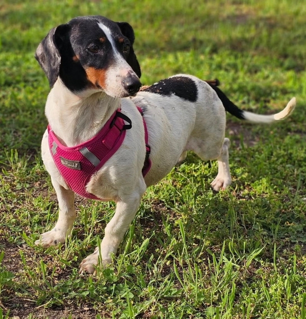 Marti, Hündin, Jack Russell-Dackel Mischling, geboren ca. 22. April 2021 (von einem ungarischen Tierarzt geschätzt), kastriert, Schulterhöhe: ca. 29 cm und ca. z.Z. 7,5-8,5 Kilo (Hals: 27-32 cm, Brust: 51-56 cm), Vermittlung zu Katzen: sie ist nicht kompatibel mit Katzen.