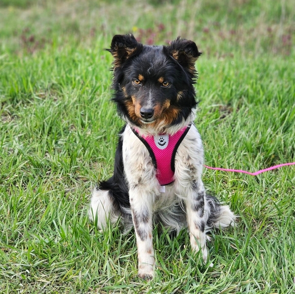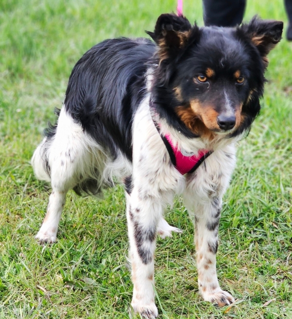Optisch trägt sie ein dunkles, schwarz-braunes Fell mit viel weiß und ist wunderschön.