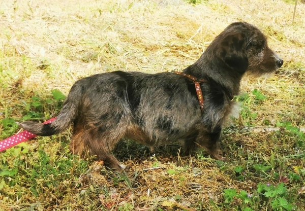 Sannerl, Hündin, Dackel Mischling, geboren ca. 01. Januar 2023 (von einem ungarischen Tierarzt geschätzt), nicht kastriert, Schulterhöhe: ca. 22 cm und z.Z. ca. 2,8-3,2 Kilo (Hals: 20-24 cm, Brust: 33-39 cm), Vermittlung zu Katzen: ja, wenn diese das Leben mit Hunden kennen. Vor der Ausreise kann nochmals getestet werden, nur eine Garantie gibt es nicht.