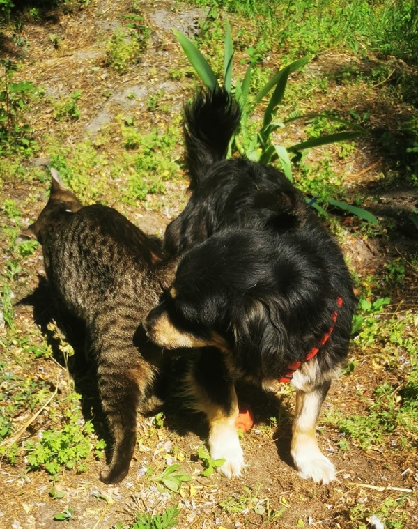 Wico passt sich an und ist freundlich zu den anderen Hunden und auch zur Hofkatze.