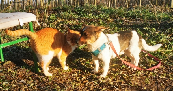 Mit Artgenossen ist er sozial, egal ob Hündin oder Rüde und auch die Hofkatzen sind okay.