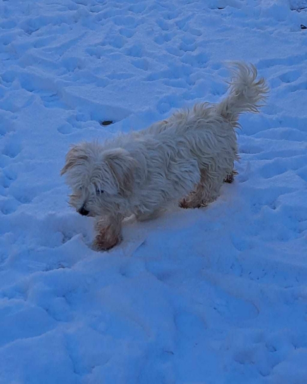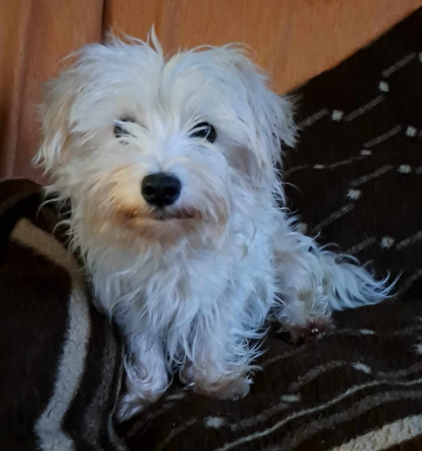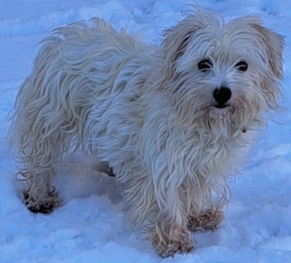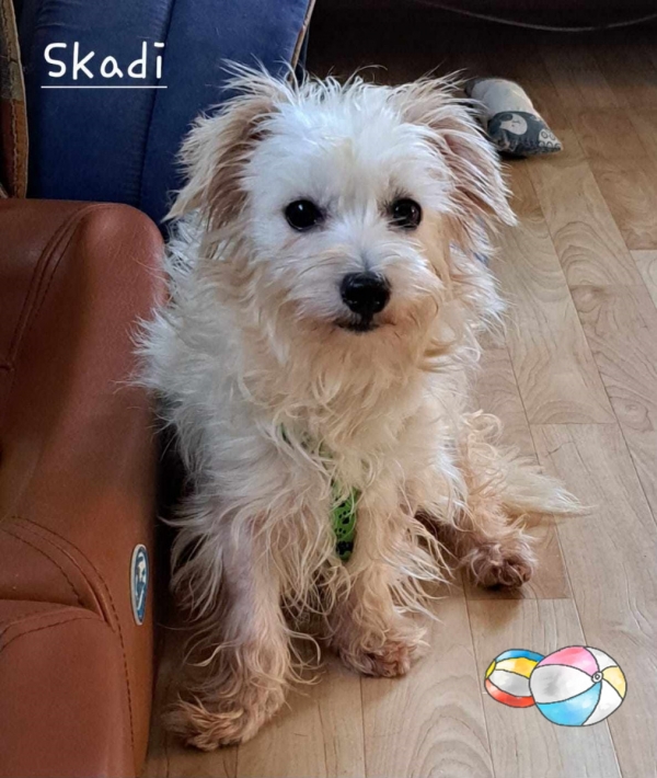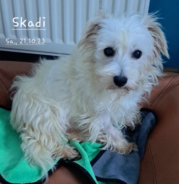 Skadi, Hündin, Malteser Mischling, geboren ca. 01. Januar 2021, kastriert, Schulterhöhe: ca. 28 cm und ca. z.Z. 4,9 Kilo, Vermittlung zu Katzen: ja, wenn diese das Leben mit Hunden kennen.