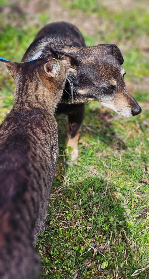 Dana ist verträglich mit allen Hunden und kennt und lebte bisher mit Freigänger-Katzen, bedrängt diese aber jetzt auf der Pflegestelle.