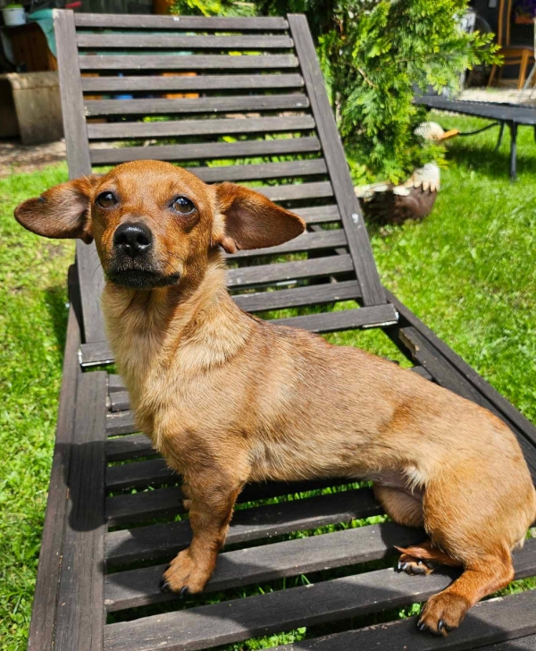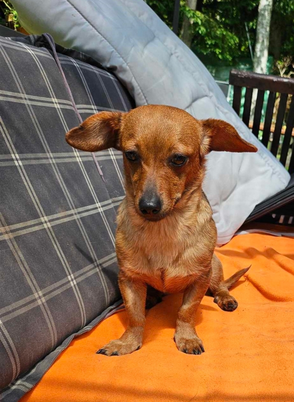 Ursi, Hündin, Chihuahua Pinscher Mischling, geboren ca. 14. Juli 2022 kastriert, Schulterhöhe: ca. 28 cm und z.Z. ca. 4,3 Kilo, Vermittlung zu Katzen: ja, wenn diese das Leben mit Hunden kennen.