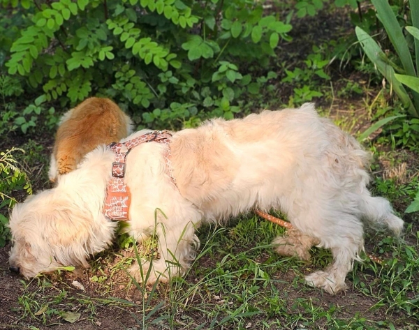 Mit anderen Hunden kommt er gut klar, jedoch sollten diese nicht zu dominant sein, Katzen sind auch kein Problem für ihn.