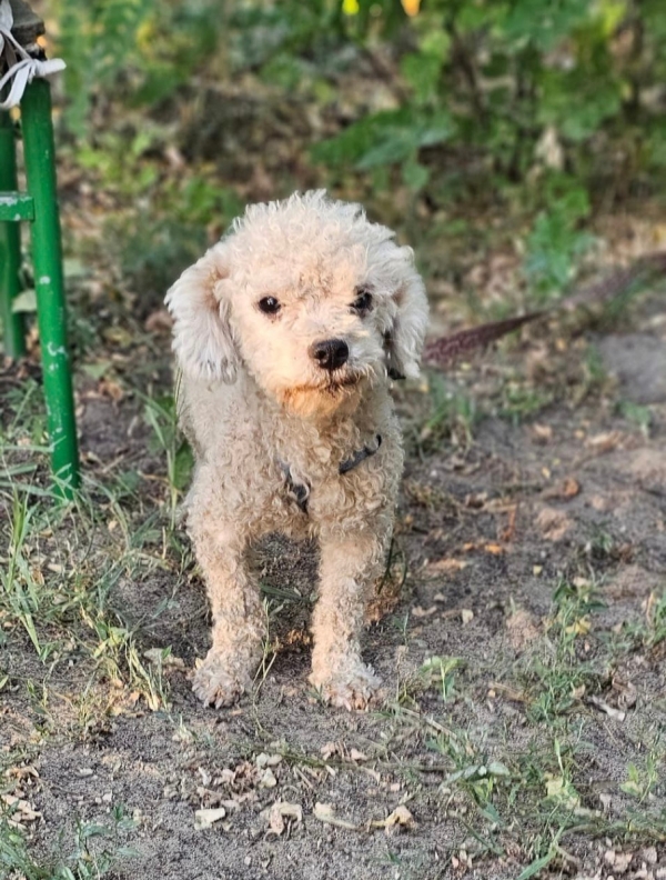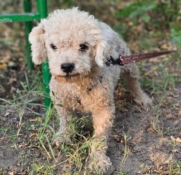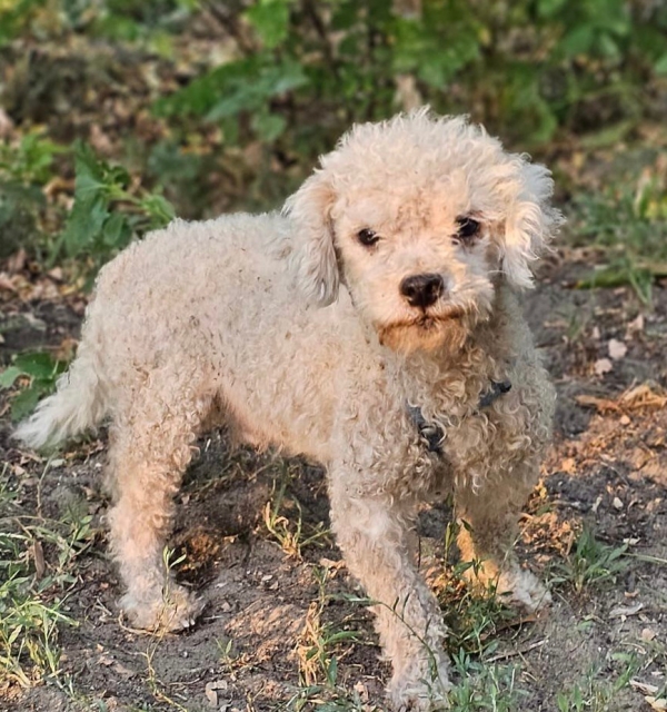 Lando, Rüde, Bologneser Mischling, geboren ca. 19. April 2020 (von einem ungarischen Tierarzt geschätzt), kastriert, Schulterhöhe: ca. 30 cm und ca. z.Z. 4,5-5 Kilo (Hals: 20-23 cm, Brust: 36-40 cm), Vermittlung zu Katzen: ja, wenn diese das Leben mit Hunden kennen.