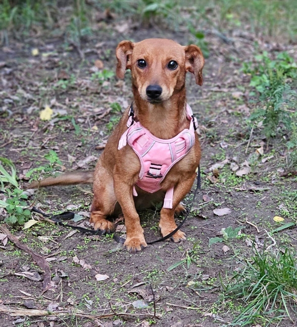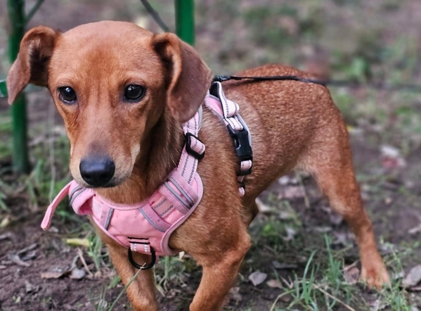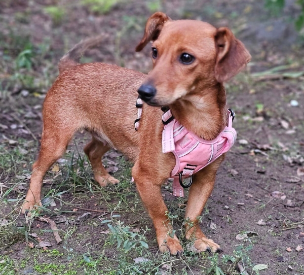 Reesie, Hündin, Dackel Mischling, geboren ca. 02. April 2022 (von einem ungarischen Tierarzt geschätzt), kastriert, Schulterhöhe: ca. 29 cm und ca. z.Z. 5,3-6,3 (Hals: 25-28 cm, Brust: 45-48 cm), Vermittlung zu Katzen: ja, wenn diese das Leben mit Hunden kennen.
