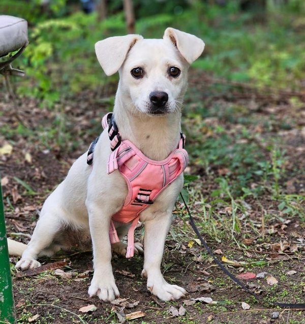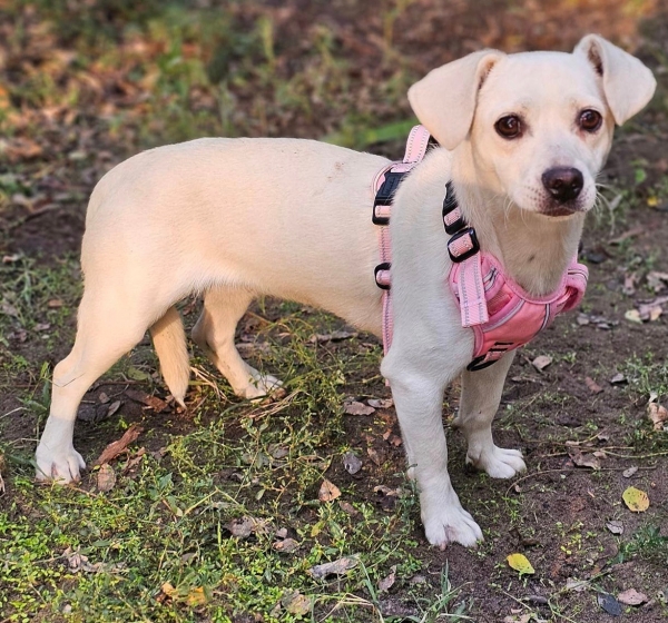 Whitney, Hündin, Mischling, geboren ca. 04. September 2023 (von einem ungarischen Tierarzt geschätzt), kastriert, Schulterhöhe: ca. 32 cm und ca. z.Z. 5,5-6,5 Kilo (Hals: 24-27 cm, Brust: 41-45 cm), Vermittlung zu Katzen: ja, wenn diese das Leben mit Hunden kennen.