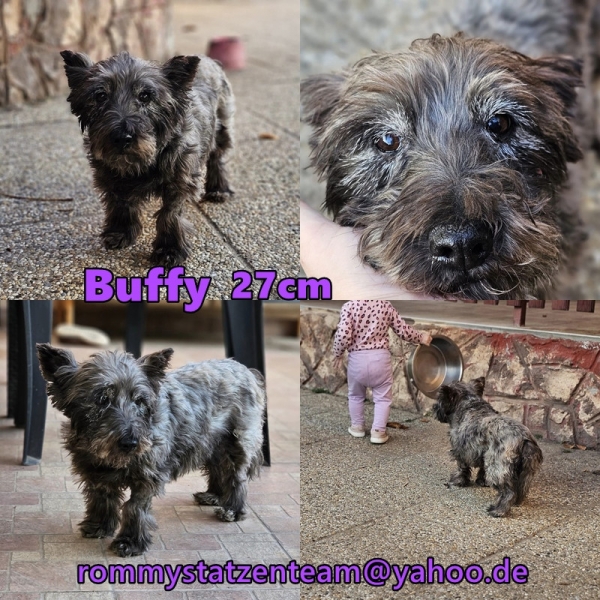Buffy, Hündin, Cairn Terrier Mischling, geboren ca. 01. September 2014 (von einem ungarischen Tierarzt geschätzt), kastriert, Schulterhöhe: ca. 27 cm und ca. z.Z. 6,5-7 Kilo (Hals: 28-31 cm, Brust: 46-49 cm), Vermittlung zu Katzen: ja, wenn diese das Leben mit Hunden kennen. Buffy hört etwas schlechter, sie ist aber nicht taub! 4d Snaptest o.B.