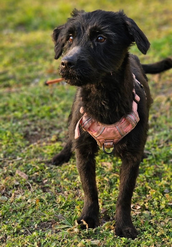 Darky, Hündin, Mischling, geboren ca. 03. Oktober 2023 (von einem ungarischen Tierarzt geschätzt), kastriert, Schulterhöhe: ca. 36 cm und ca. z.Z. 6-7,5 Kilo (Hals: 29-33 cm, Brust: 41-46 cm), Vermittlung zu Katzen: ja, wenn diese das Leben mit Hunden kennen. Auf Wunsch wird auch extra nochmals getestet, nur eine Garantie gibt es nicht.