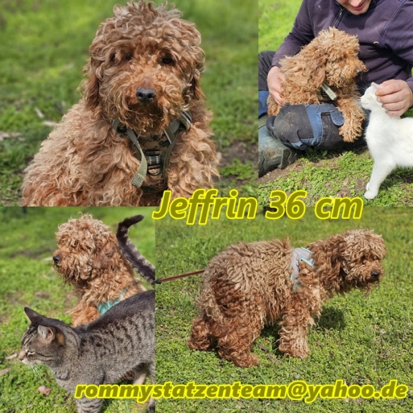 Kurzinfo: Regelmäßige Fellpflege ist bei den Lockenhunden sehr wichtig und es kann sein, das Jeffrin vor der Ausreise geschoren werden muss, weil die Verfilzungen sonst nicht zu entfernen sind.