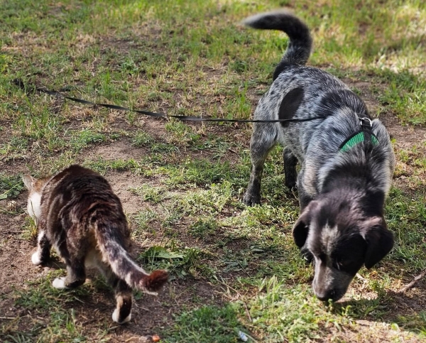 BITTE DOPPELSICHERUNG, Zug-Stopp-Halsband und Sicherheitsgeschirr und 2 Leinen und Anhänger mit Eurer Telefonnummer.