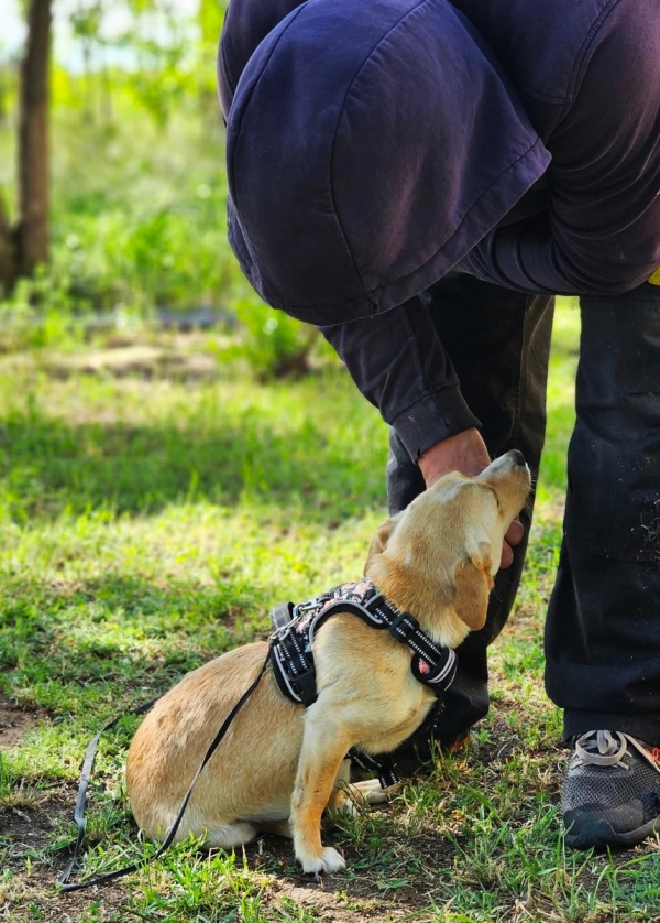 An der Leine läuft sie, aber halt links-rechts, wie es ihr gefällt, schnüffelnd in der Natur, denn alles ist spannend, war sie doch lange Zeit angekettet.