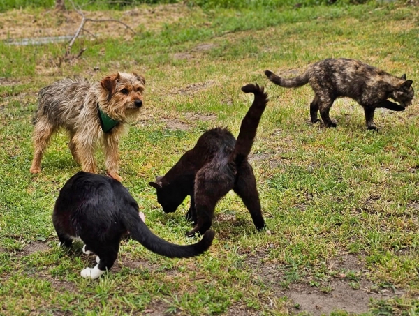 Andere Hunde und Katzen sind für ihn kein Problem, er zeigt ein gutes Sozialverhalten.