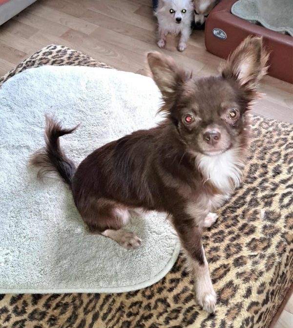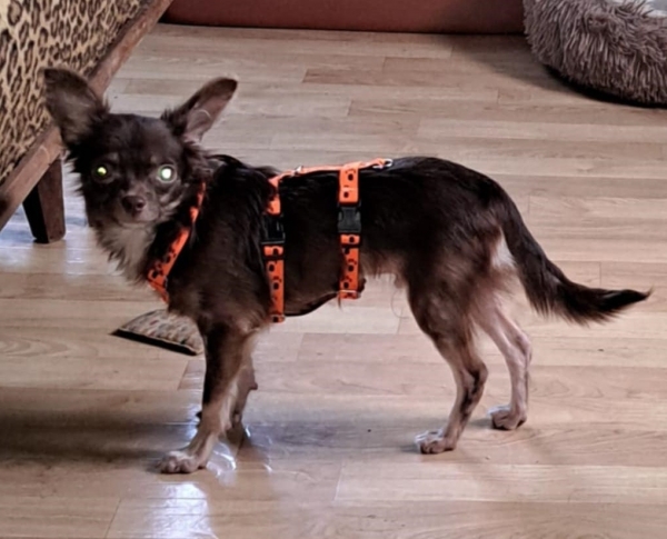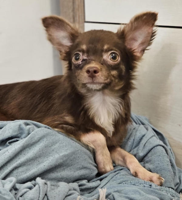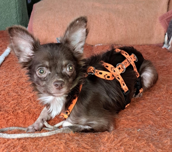 Dio, Rüde, Chihuahua Mischling, geboren ca. 20. Januar 2025, nicht kastriert, Schulterhöhe: ca. 25 cm und ca. z.Z. 2,2 Kilo, Vermittlung zu Katzen: ja, wenn diese das Leben mit Hunden kennen