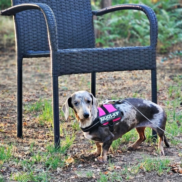 Uschi hat sehr kurze Beine und sollte keine Treppen laufen müssen und auch keine Gewaltmärsche über Stock und Stein machen.