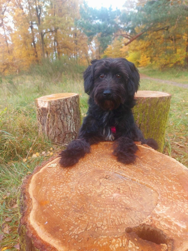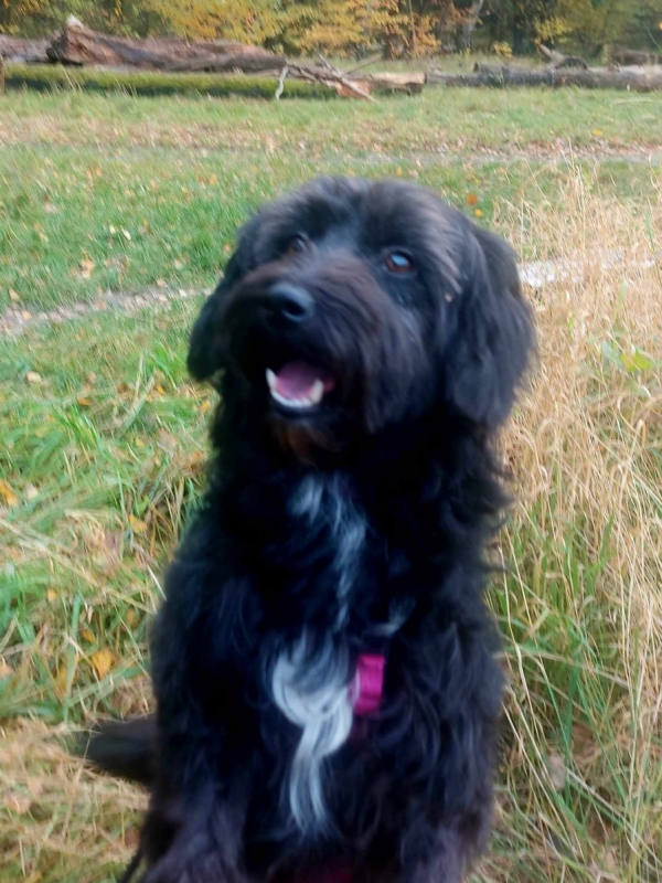 Rogella, Hündin, Puli Mischling, geboren ca. 01. Juli 2024, kastriert, Schulterhöhe: ca. 38 cm und ca. z.Z. 8,5-10 Kilo, Vermittlung zu Katzen: ja, wenn diese das Leben mit Hunden kennen.