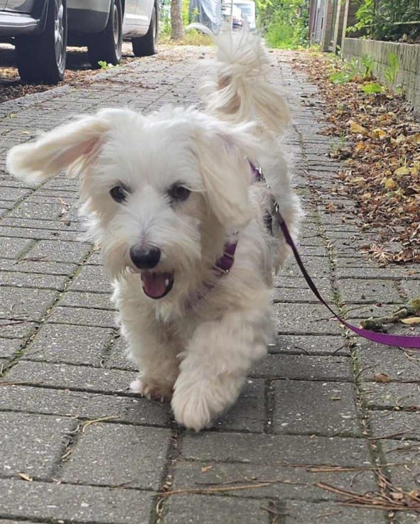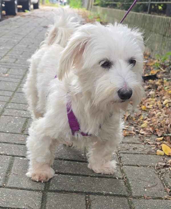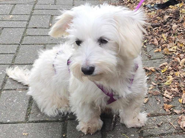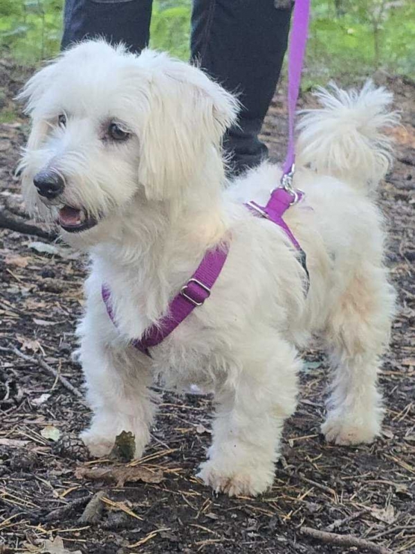 Havel, Rüde, Malteser Mischling, geboren 10. November 2020, kastriert, Schulterhöhe: ca. 28 cm, Vermittlung zu Katzen: ja, wenn diese das Leben mit Hunden kennen