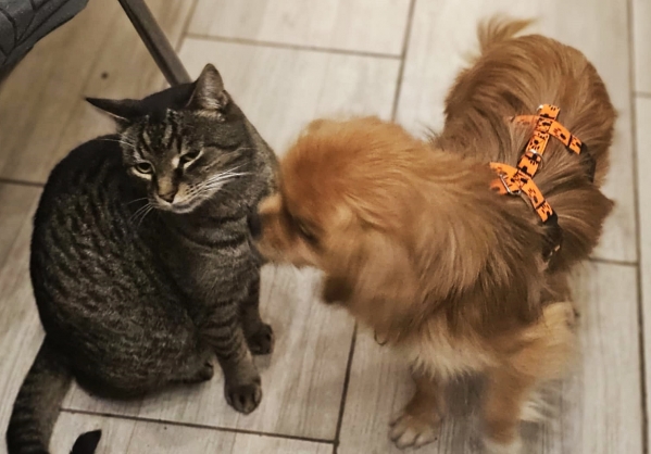 Mit den meisten Hunden und Katzen versteht er sich sehr gut und sollte auch weiter soziale Kontakte zu freundlichen Hunden haben.