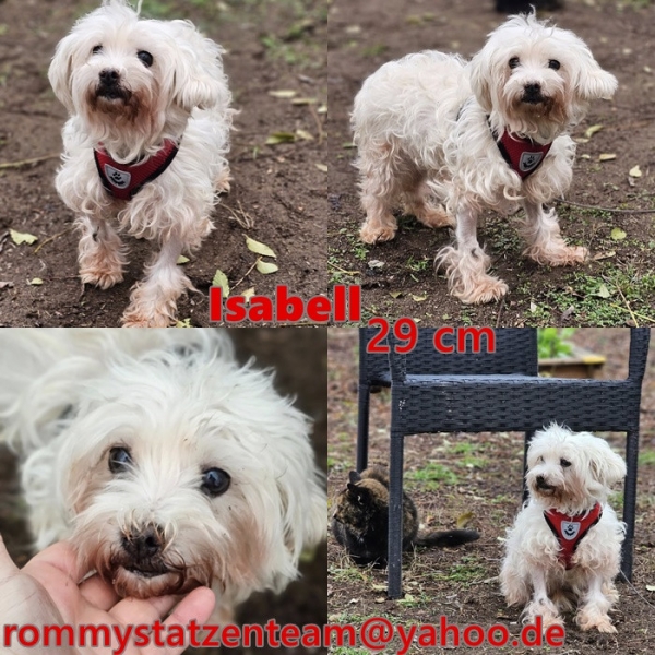 Isabell, Hündin, Malteser Mischling, geboren ca. 01. November 2015 (von einem ungarischen Tierarzt geschätzt), reist kastriert, Schulterhöhe: ca. 29 cm und ca. z.Z. 3,5-4,5 Kilo (Hals: 23-27 cm, Brust: 39-45 cm), Vermittlung zu Katzen: ja, wenn diese das Leben mit Hunden kennen. Auf Wunsch wird auch extra nochmals getestet, nur eine Garantie gibt es nicht.