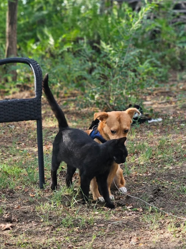 Auch mit anderen Hunden ist Emilan verträglich, für Katzen scheint er sich nur freundlich zu interessieren, sie schmusen mit ihm.