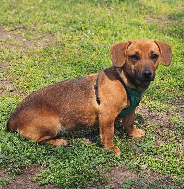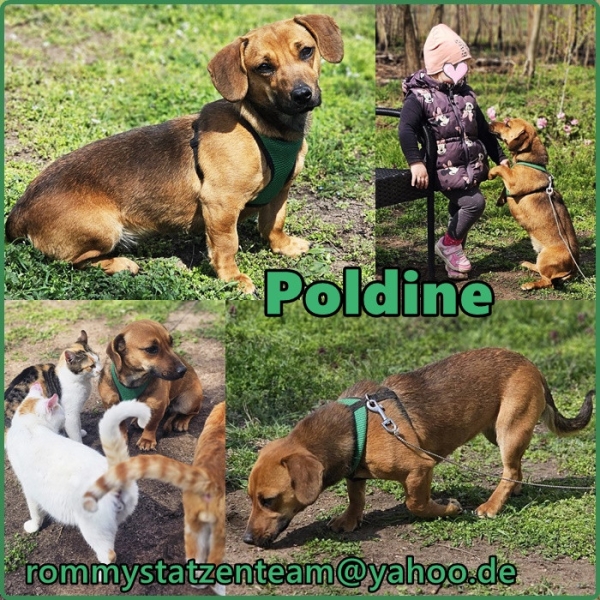 Poldine, Hündin, Dackel Mischling, geboren ca. 13. März 2025, reist kastriert, Schulterhöhe: ca. 29 cm und ca. z.Z. 5-6 Kilo (Hals: 29-32 cm, Brust: 43-48 cm), Vermittlung zu Katzen: ja, wenn diese das Leben mit Hunden kennen. Auf Wunsch wird auch extra nochmals getestet, nur eine Garantie gibt es nicht.