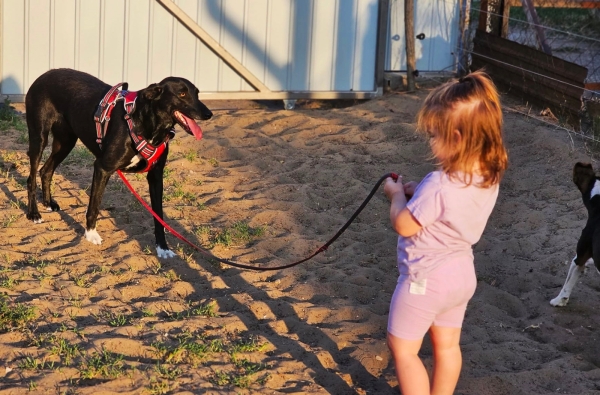In ländlicher Umgebung läuft sie zügig an der Leine, allerdings so wie es ihr gefällt. Man merkt, dass sie bisher wenig Erziehung genossen hat – Regeln, Strukturen und Alltagssituationen sind für sie noch Neuland.