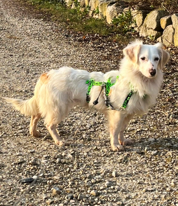 Sie ist stubenrein und läuft sehr zügig an der Leine und mag es zu schauen zu schnüffeln und die Welt zu entdecken.
